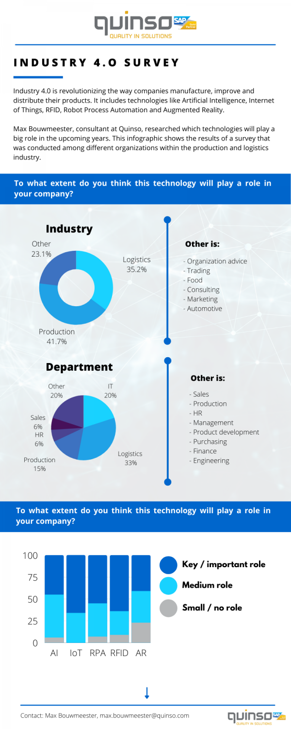 Bij Quinso willen we onze klanten graag ondersteunen in hun reis naar een compleet gedigitaliseerde supply chain. Max Bouwmeester, consultant bij Quinso, onderzocht welke technieken van Industry 4.0 volgens organisaties de grootste rol gaan spelen de komende jaren. Door het in kaart brengen van de bevindingen kunnen we onze klanten nog beter helpen bij het behalen van hun doelstellingen.