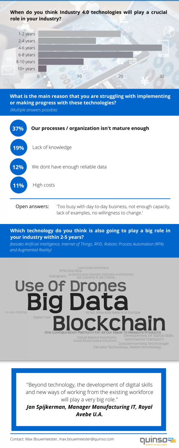 In de infographic is te zien dat Industry 4.0 naar verwachting vooral voor de afdelingen logistiek, IT en productie een grote rol gaat spelen. 30% van de ondervraagden verwacht dat deze verschuiving tussen de 4 en 6 jaar zal plaatsvinden. De technologie die naar verwachting de grootste rol gaat spelen is Internet of Things (IoT). De grootste uitdaging bij de implementatie en progressie van deze technologieën? Dat is volgens 37% van de ondervraagden dat de processen binnen de organisatie er nog niet klaar voor zijn.
