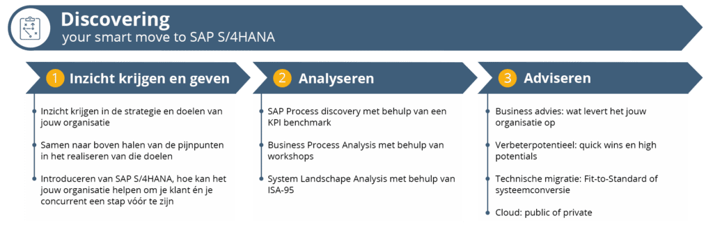 - Discovering: het resultaat van deze fase is een advies hoe jij het beste de overgang naar SAP S/4HANA aan kunt pakken